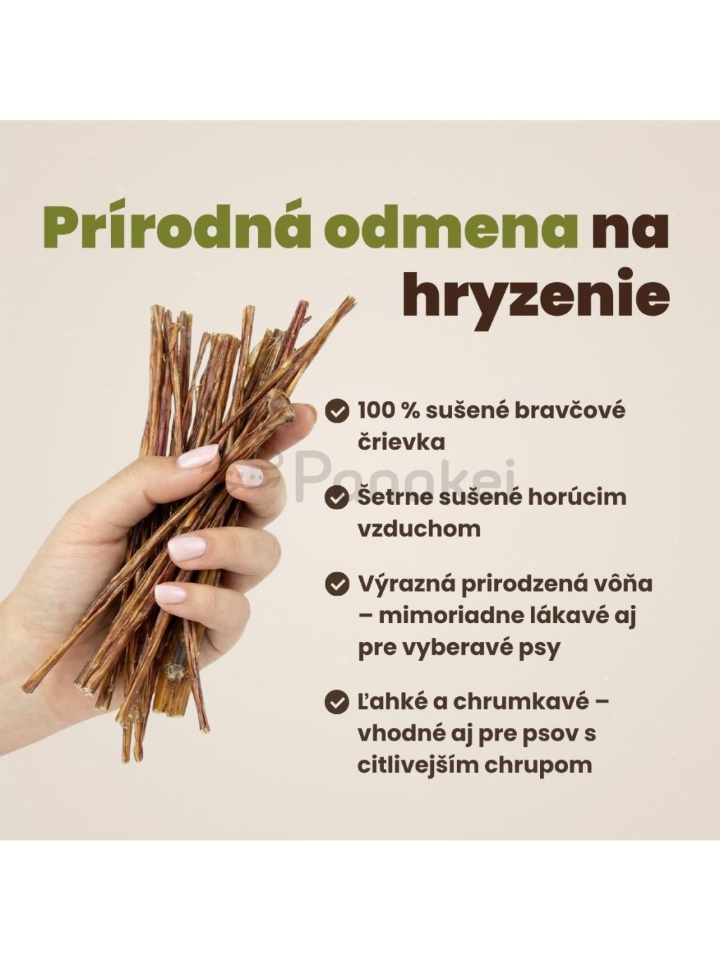 Črievka (špagetky) majú ohybné a mäkšie spracovanie, vďaka čomu sa jednoducho hryzú a vyhovujú aj psom, ktoré nemajú zuby alebo preferujú jemnejšie a mäkšie maškrty.